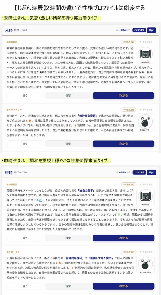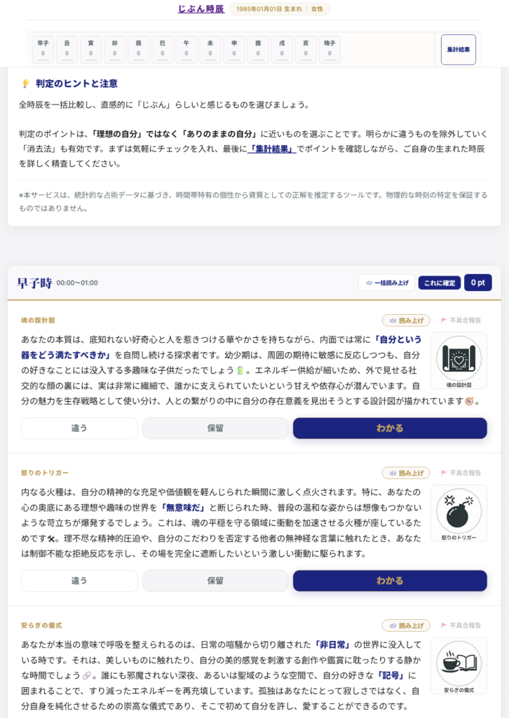 1925年以降の全日付、1,000,000通り以上の命盤データをLLM(大規模言語モデル)で事前解析。ユーザーは1日13通りの「性格プロファイル」から自分の内面と合致するものを選び取ることで、占術的な誕生時間を特定し、深層心理に迫る客観的な自己分析を行えます。