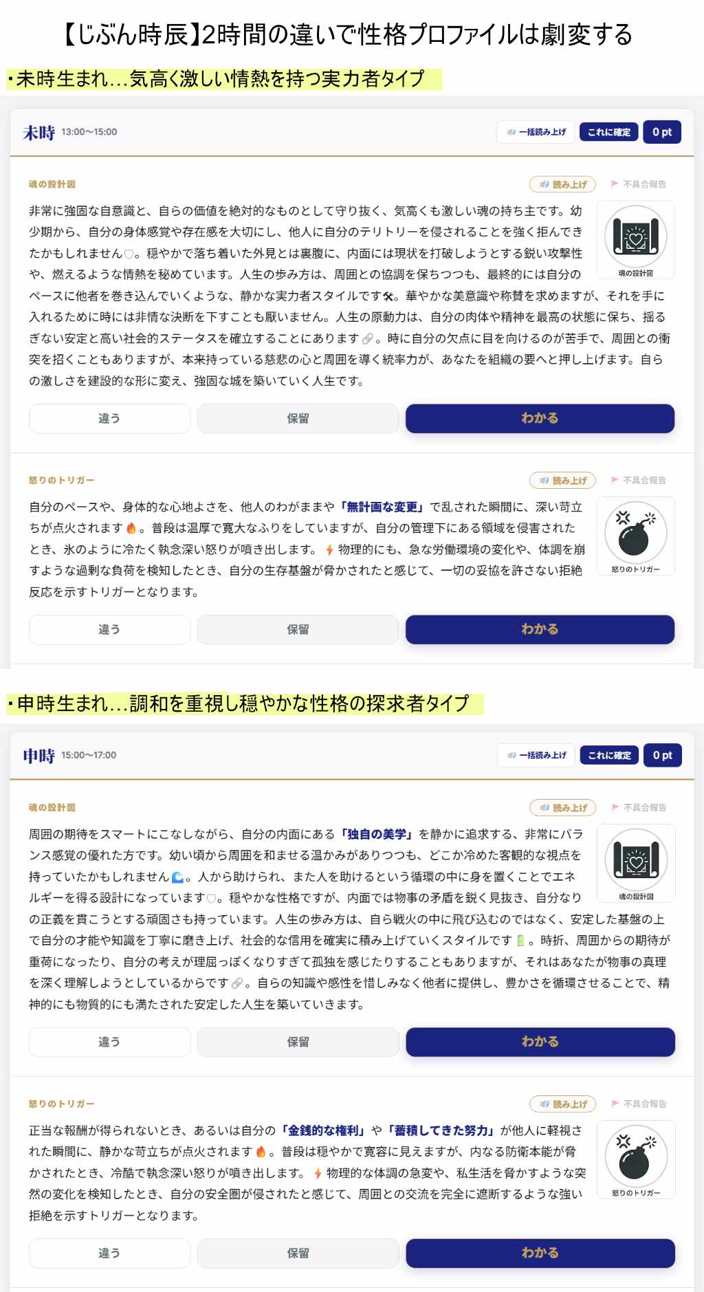100万通りの人格データを構造化。1日13パターンのプロファイルから自分に合うものを選ぶだけで、専門知識なし・無料で出生時間を特定できます。