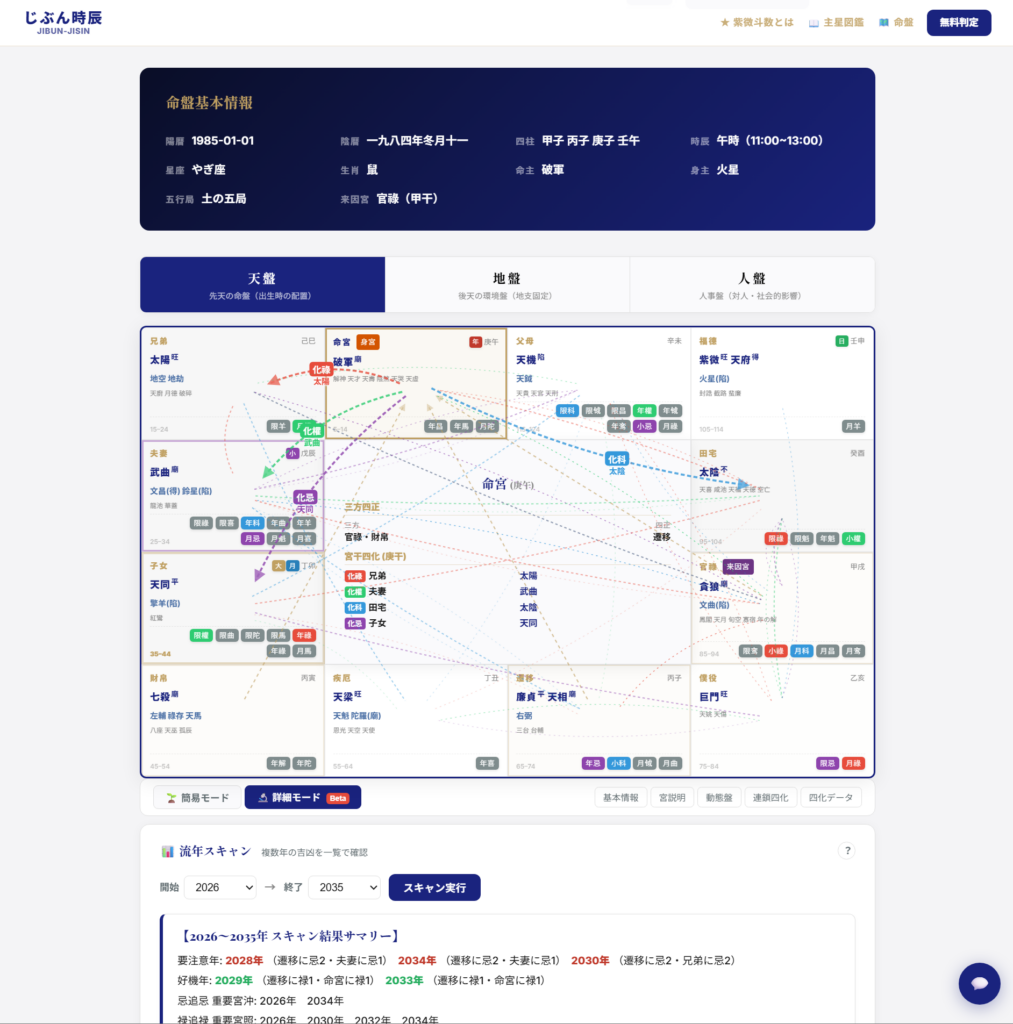 手間を要する時辰判定をユーザーの自己認知に任せ、即座に本格的な命盤を展開。複雑な四化飛星(エネルギーの連鎖)の視覚化・全星解釈の簡易辞書も準備されており、鑑定の土台を固めるツールとしてもご活用いただけます。