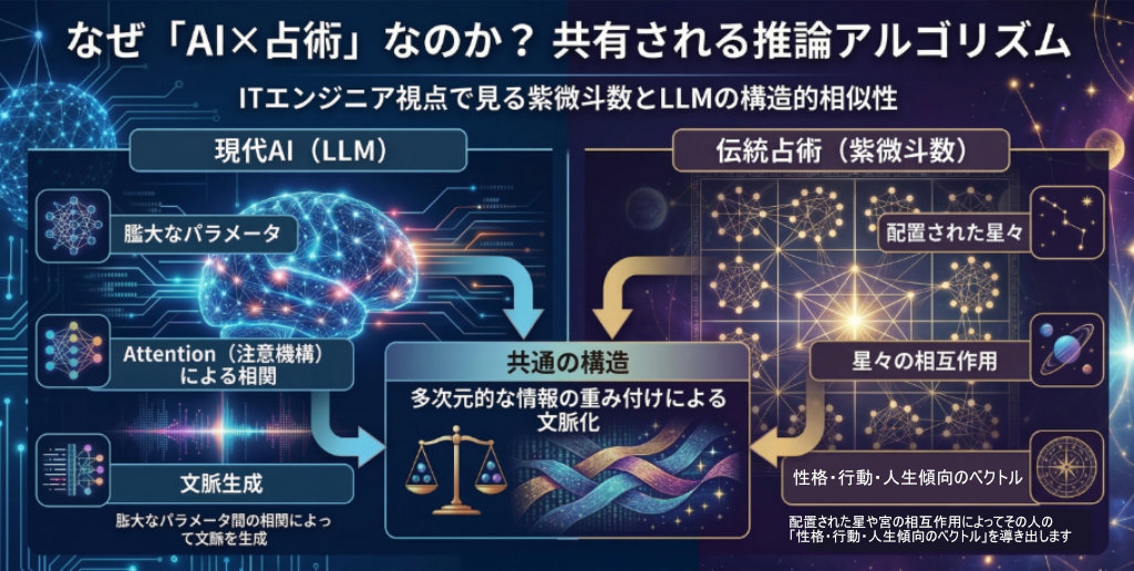 LLMが膨大なパラメータ間の相関(Attention)によって文脈を生成するように、紫微斗数もまた、配置された星や宮の相互作用によってその人の「性格・行動・人生傾向のベクトル」を導き出します。どちらも「多次元的な情報の重み付けによる文脈化」という共通のプロセスを採用しており、この構造的相似性が、古の叡智を最先端AIで実装することへの論理的根拠となっています。