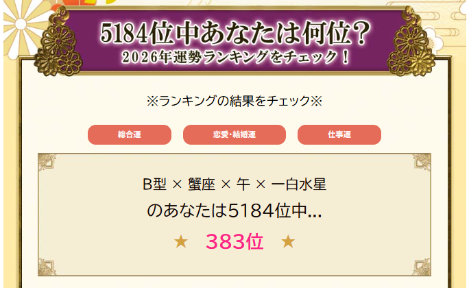 ◆2026年の運勢ランキング|生年月日&血液型占いで順位発表「5184位中あなたは何位?」