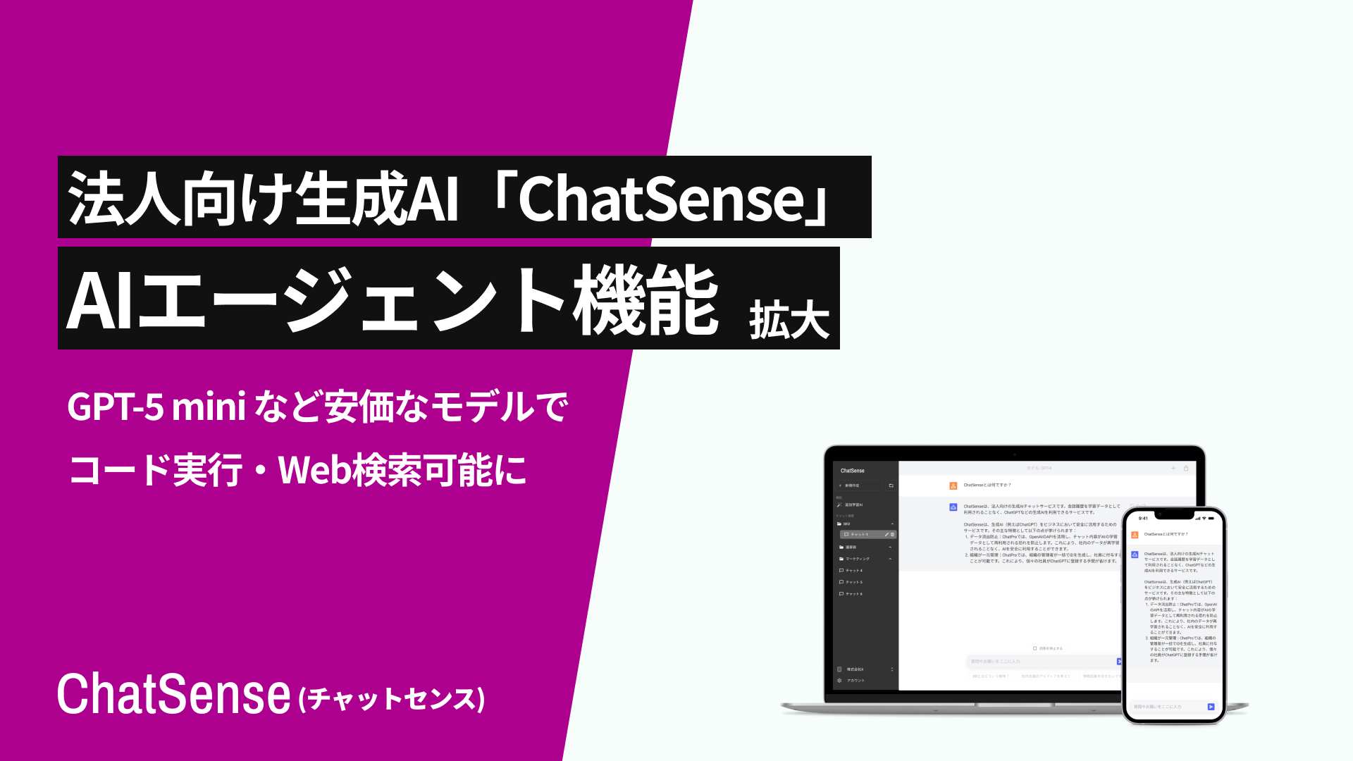 株式会社ナレッジセンス(本社:東京都港区、代表取締役:門脇敦司、以下ナレッジセンス)は、セキュリティ高い環境でChatGPTを活用できる法人向け生成AIエージェントサービス「ChatSense」において、デフォルト搭載モデルの機能を大幅に拡大いたします。 2026年2月1日より、「GPT-5 mini」および「GPT-5 Thinking」モデルにおいて、Web検索やファイル分析が可能な「プラグイン機能」を標準で利用可能にします。「コードインタープリター」機能の詳細は、こちらをご覧ください。